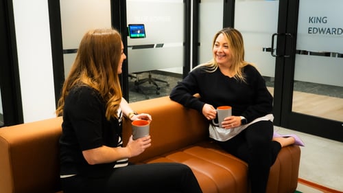 Photo: Stacie et Jennifer boivent un café ensemble au siège de Payworks.